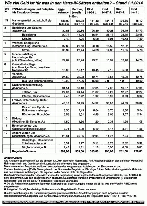 Hier die Tabelle „Wie viel Geld ist für was in Hartz IV enthalten? – Stand: 1.1.2014“ von der Koordinierungsstelle gewerkschaftlicher Arbeitslosengruppen–Berlin